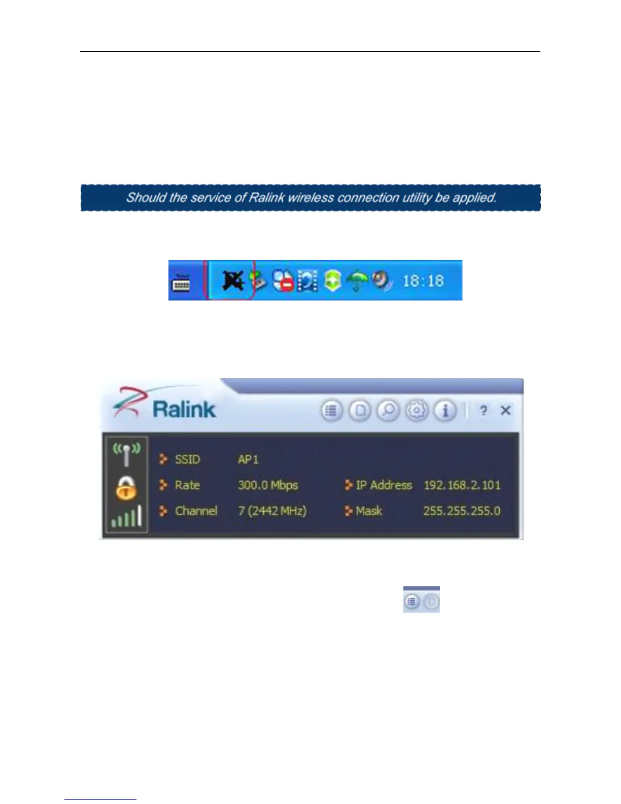 1) After the installation of Ralink utility, the system shows a special wireless utility icon in the Windows