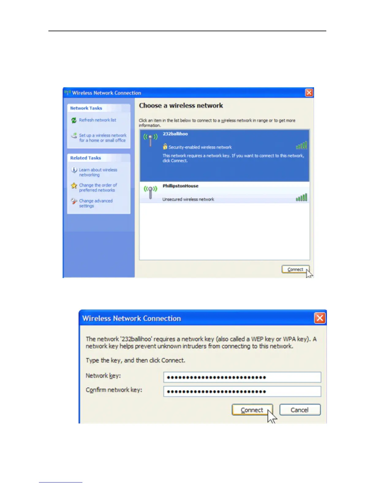 in both the Network key and Confirm network key boxes, and then click “ Connect ” .