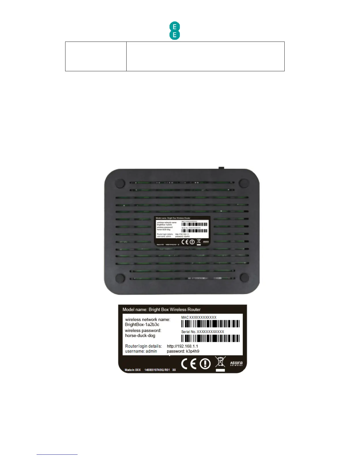 • Wireless network name (also known as SSID), e.g. BrightBox-1a2b3c