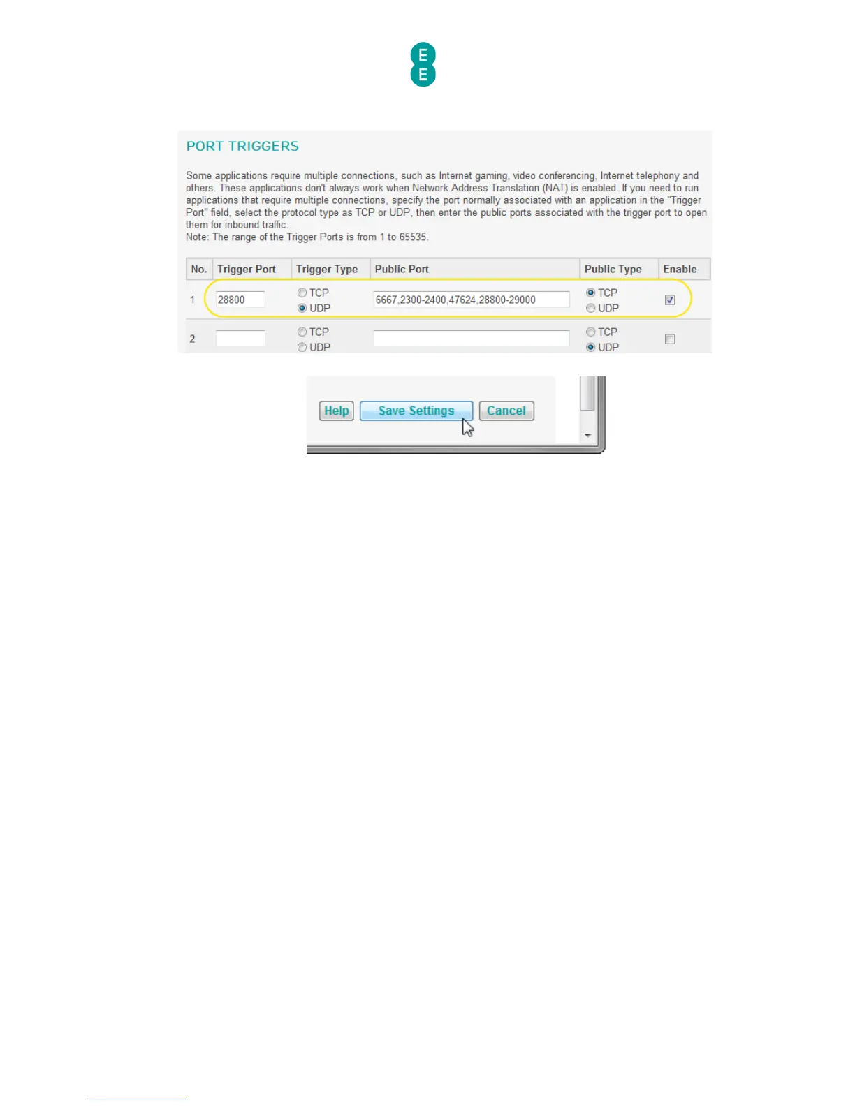 9. Tick the ‘enable’ box to enable the port triggering entry: