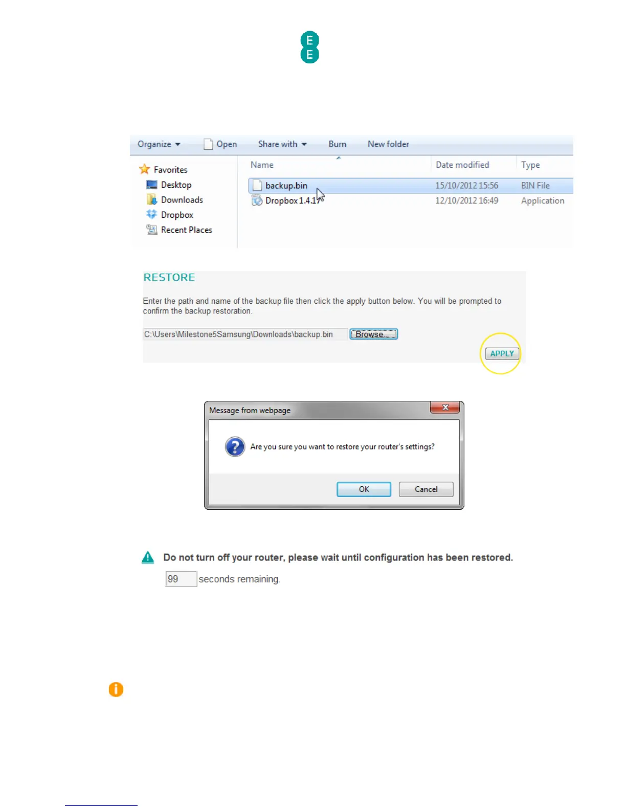 9. When prompted whether you want to restore your router’s settings, click OK: