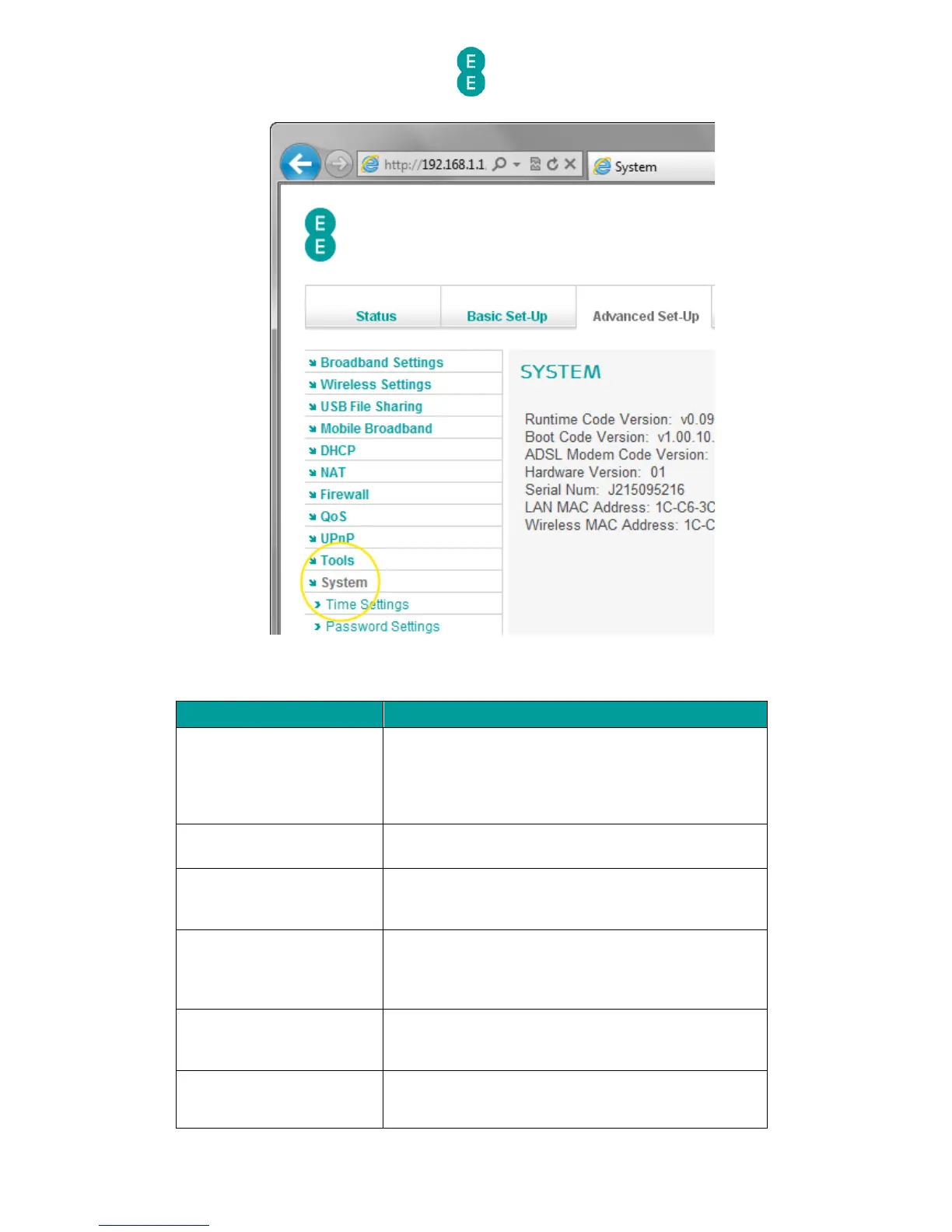 The System page displays additional details about your router, including hardware, MAC