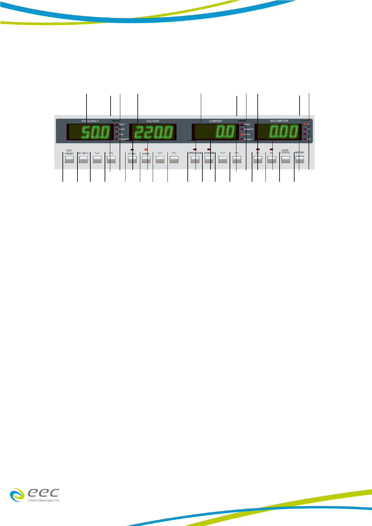 5. Meter Key. Select the display of output wattage (P)、 power factor (PF) 、 test time or Program-Step.