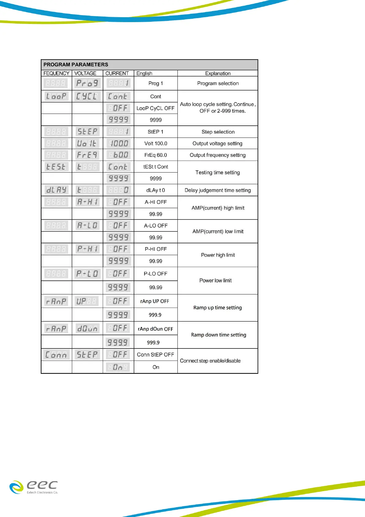 different settings on voltage, frequency, testing time, current, power, and power factor high/low