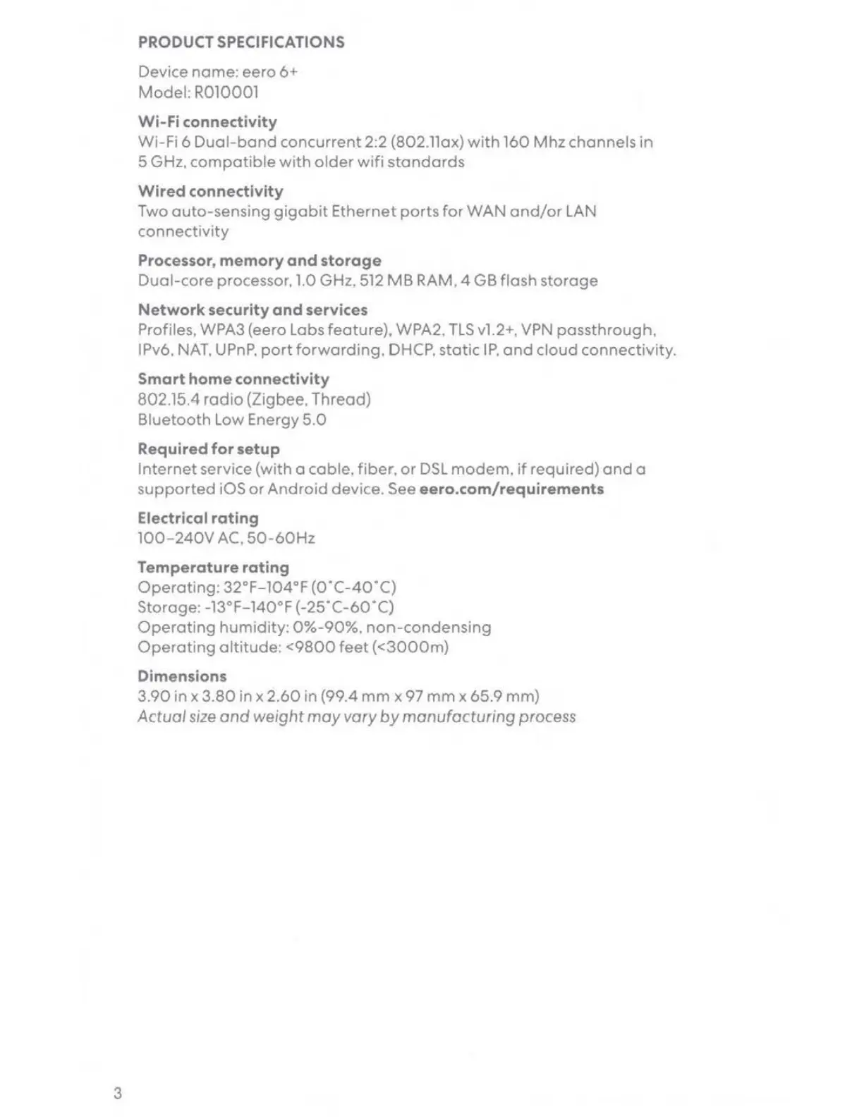 eero 6+ RO10001 - Product Specifications; Connectivity and Performance; Requirements and Ratings; Physical Dimensions