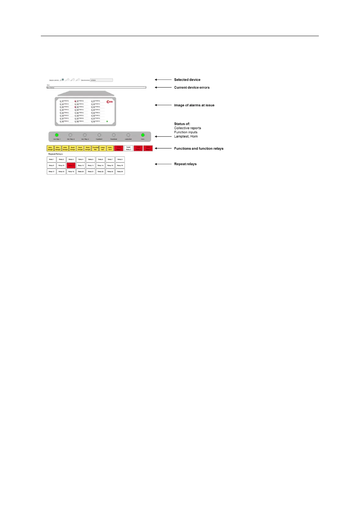 The states of the 4 function relays and, if available, the 1:1 relays are also displayed (red excited,