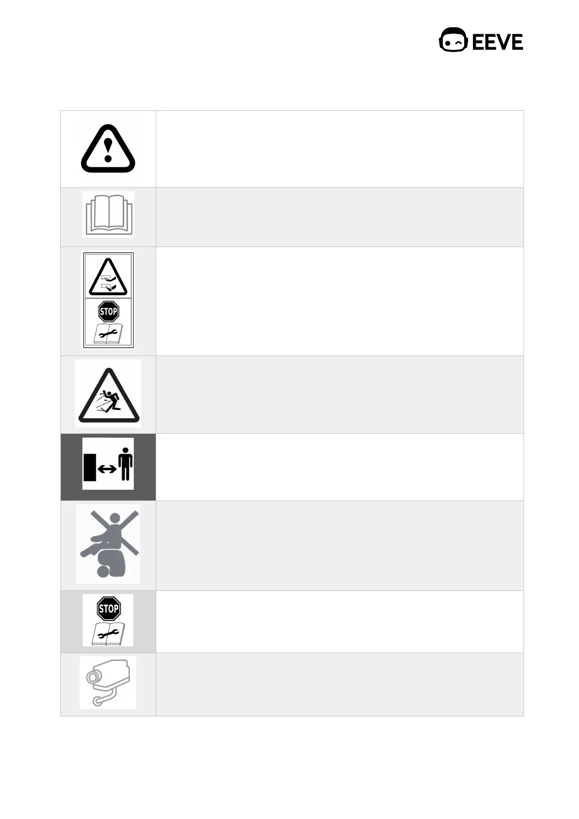 The following safety symbols are found on the personal robot and on each EEVE-sign: "