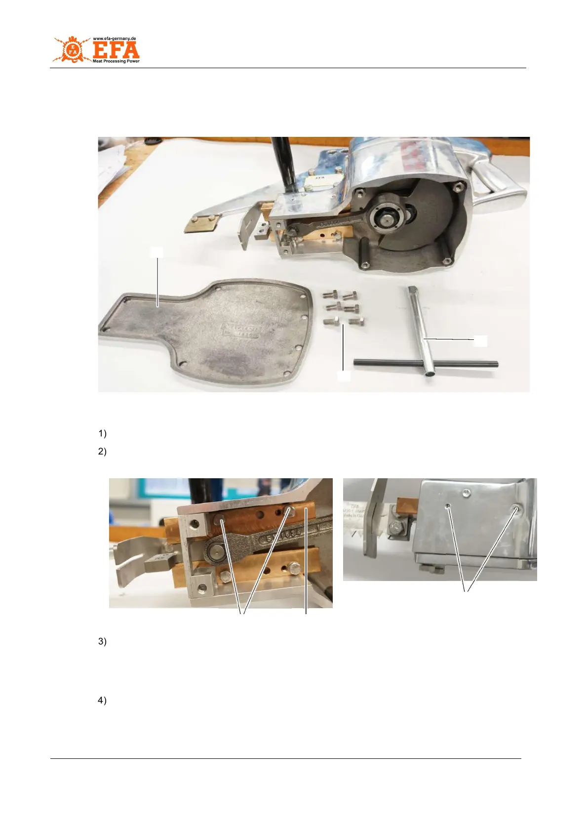 After adjusting the slider clearance, retighten the hexagon screws (4). Mount the saw blade as described