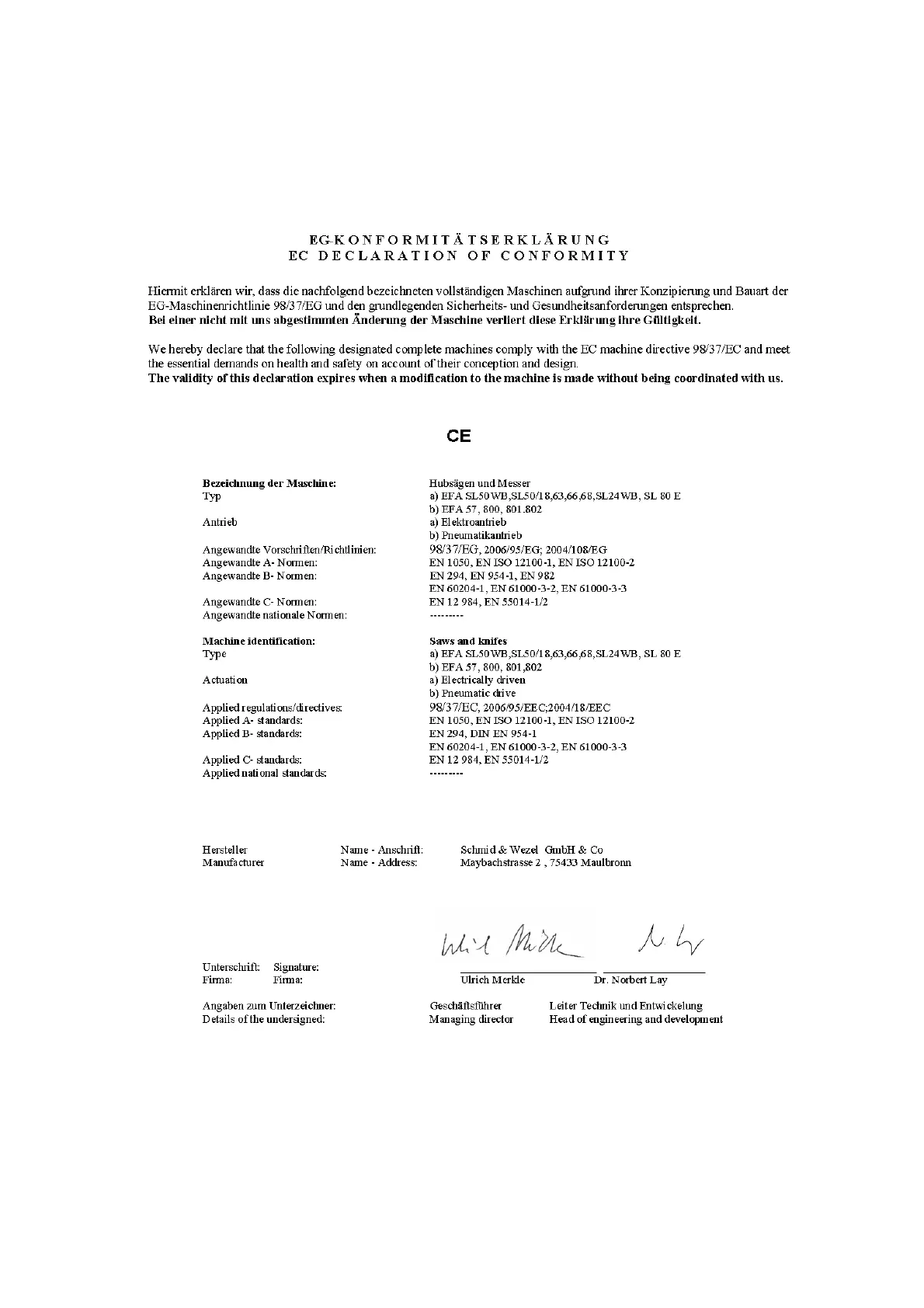 EFA SL 50/ 18 - Konformitätserklärung; Declaration of Conformity