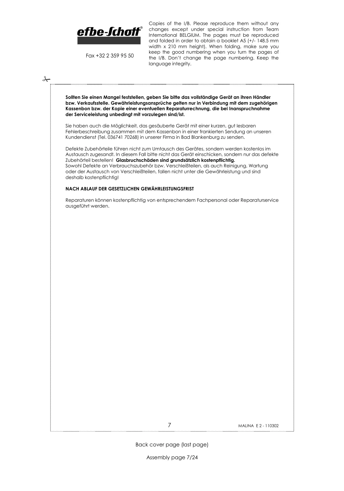 Defekte Zubehörteile führen nicht zum Umtausch des Gerätes, sondern werden kostenlos im