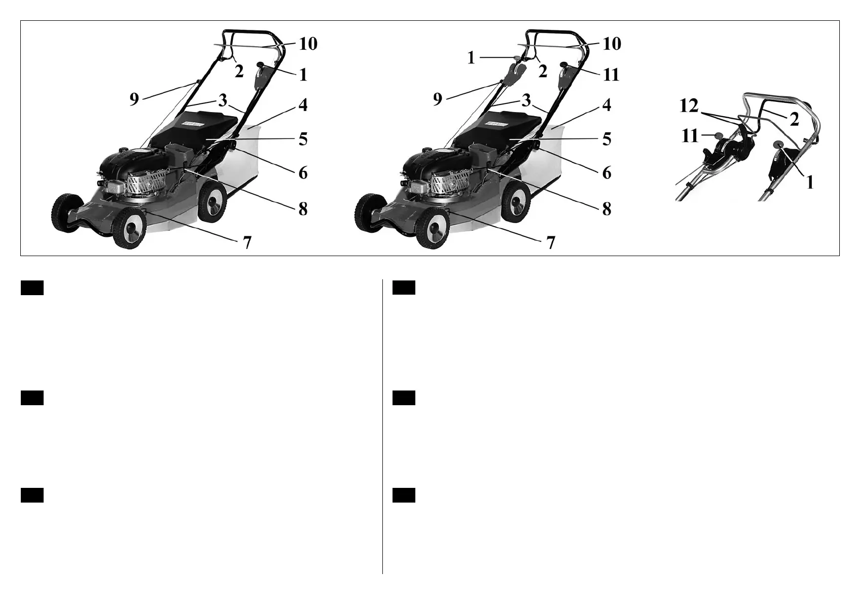 6 - Réglage de hauter du guidon 12 - Commande frein de lame