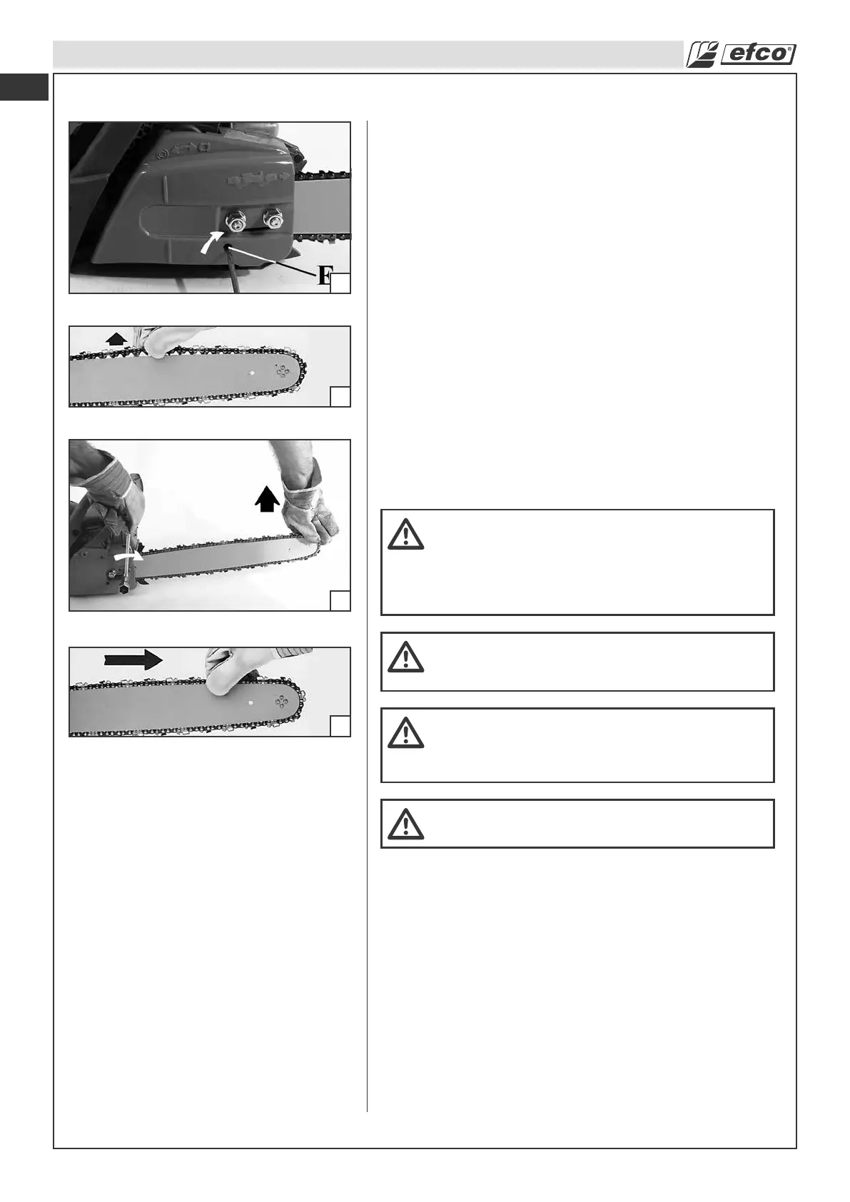 10. Tense la cadena girando el tornillo de tensión (E) en el sentido