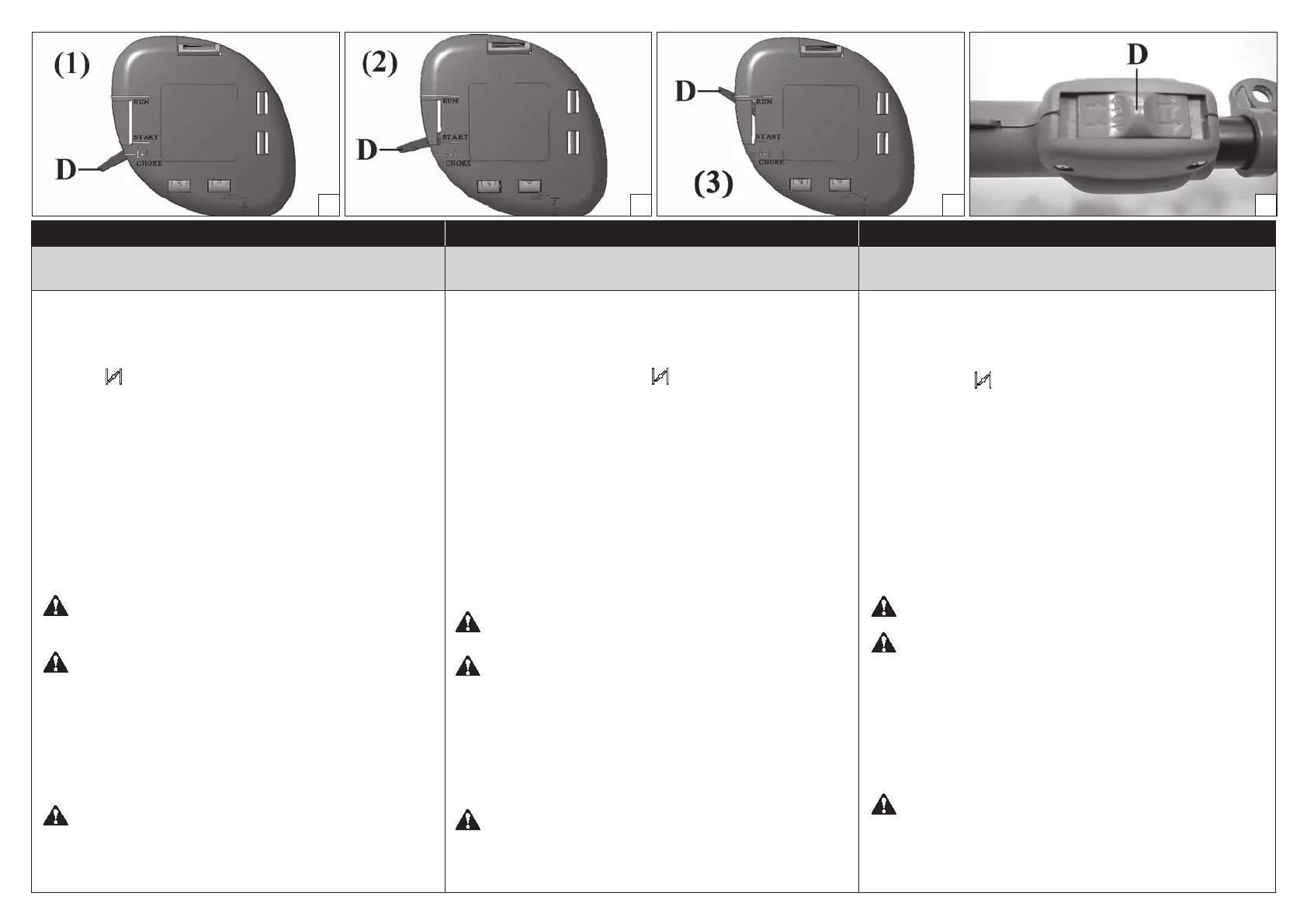 zu hören ist. Den Starterhebel (D) auf halb geschlossene, mittlere Stellung