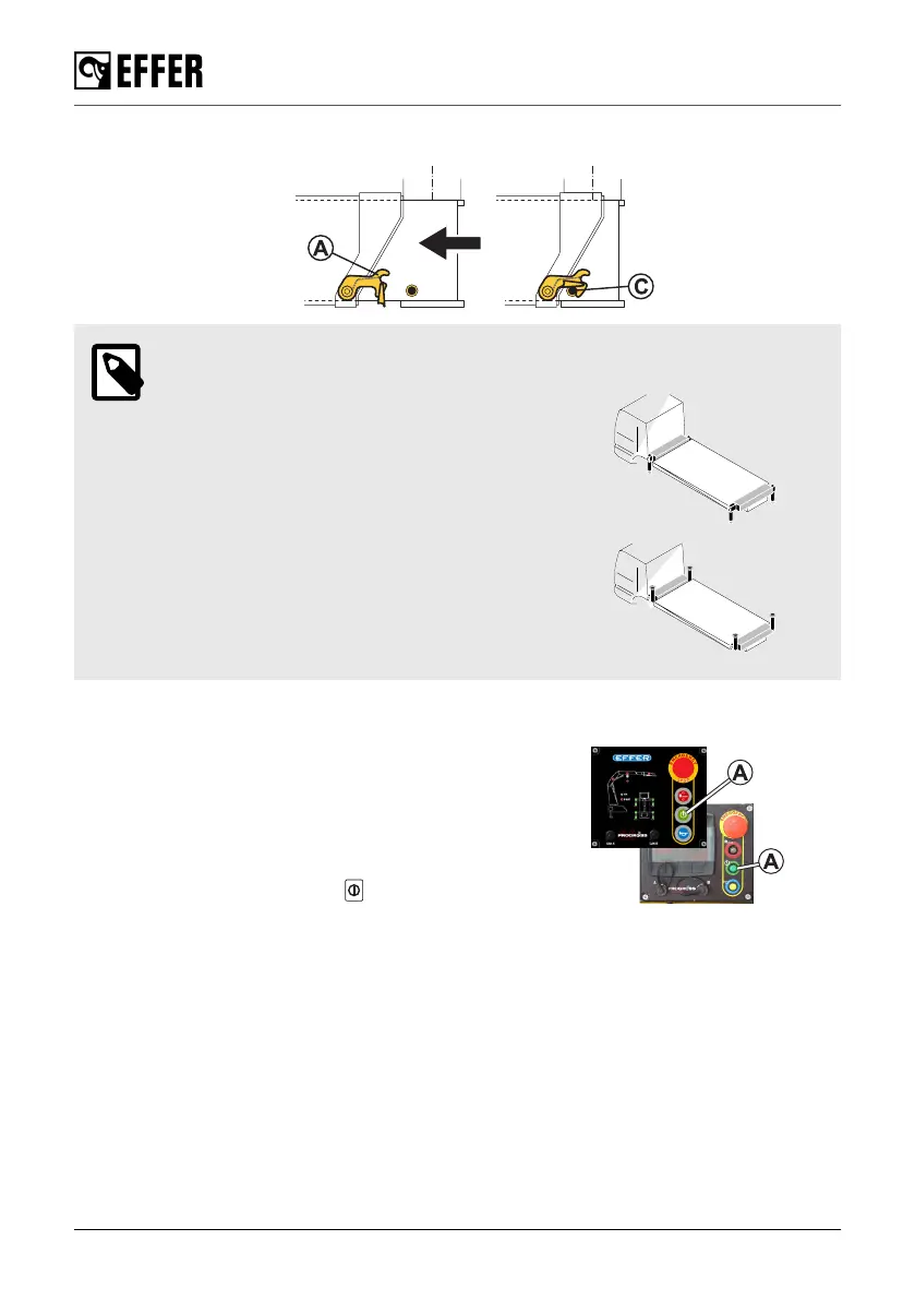 3. Verify that the mechanical stops are locking the system correctly (pin (C) locked by the catcher