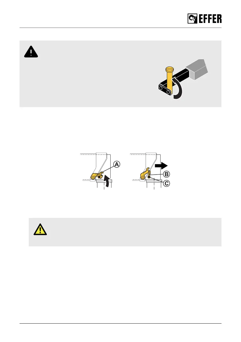 1. Move the stabiliser locking device (A) up, put reference (B) on pin (C) as shown in the picture.