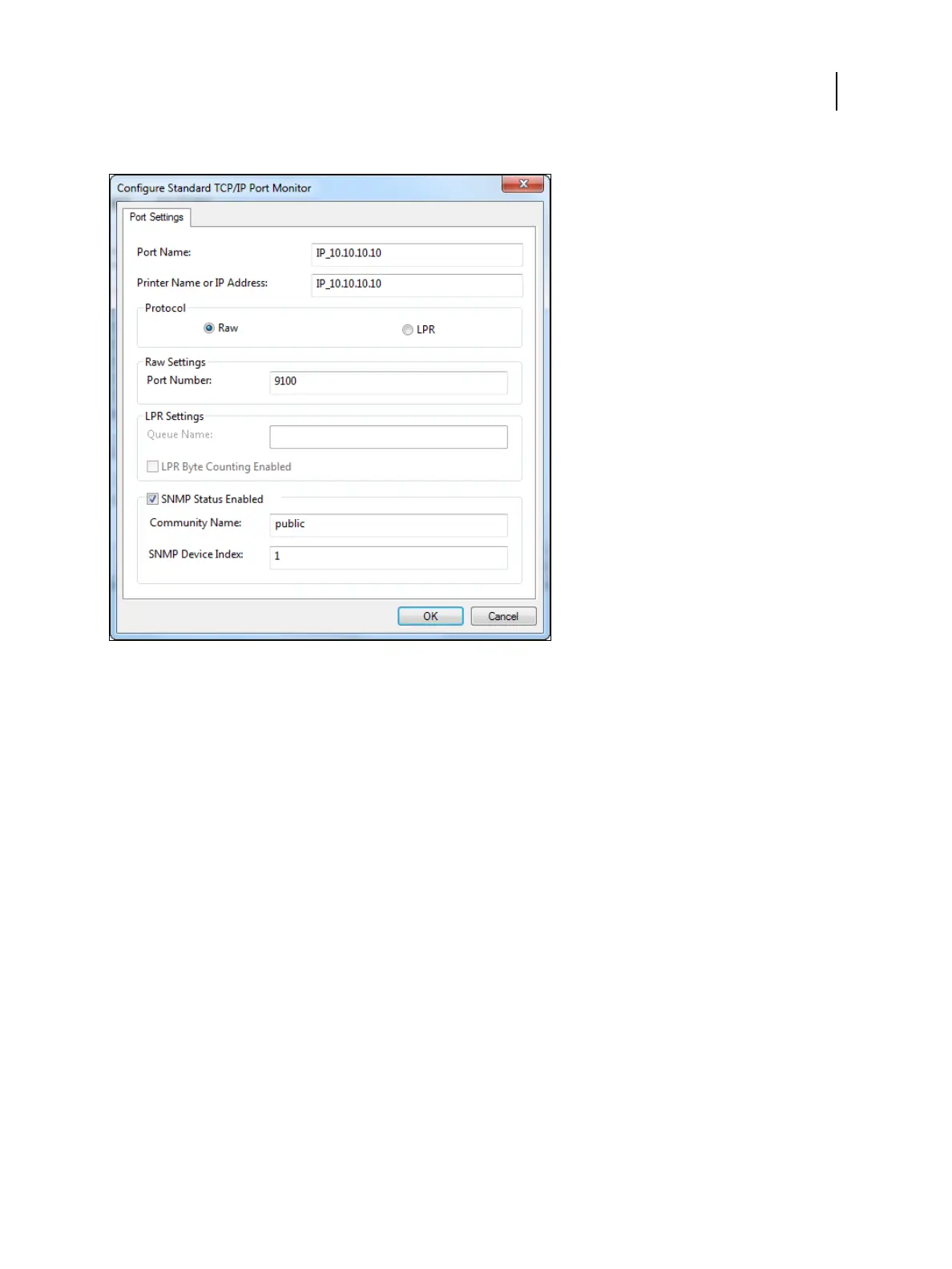 The port number 9100 automatically appears in the Raw Settings area. This is the default port number. You