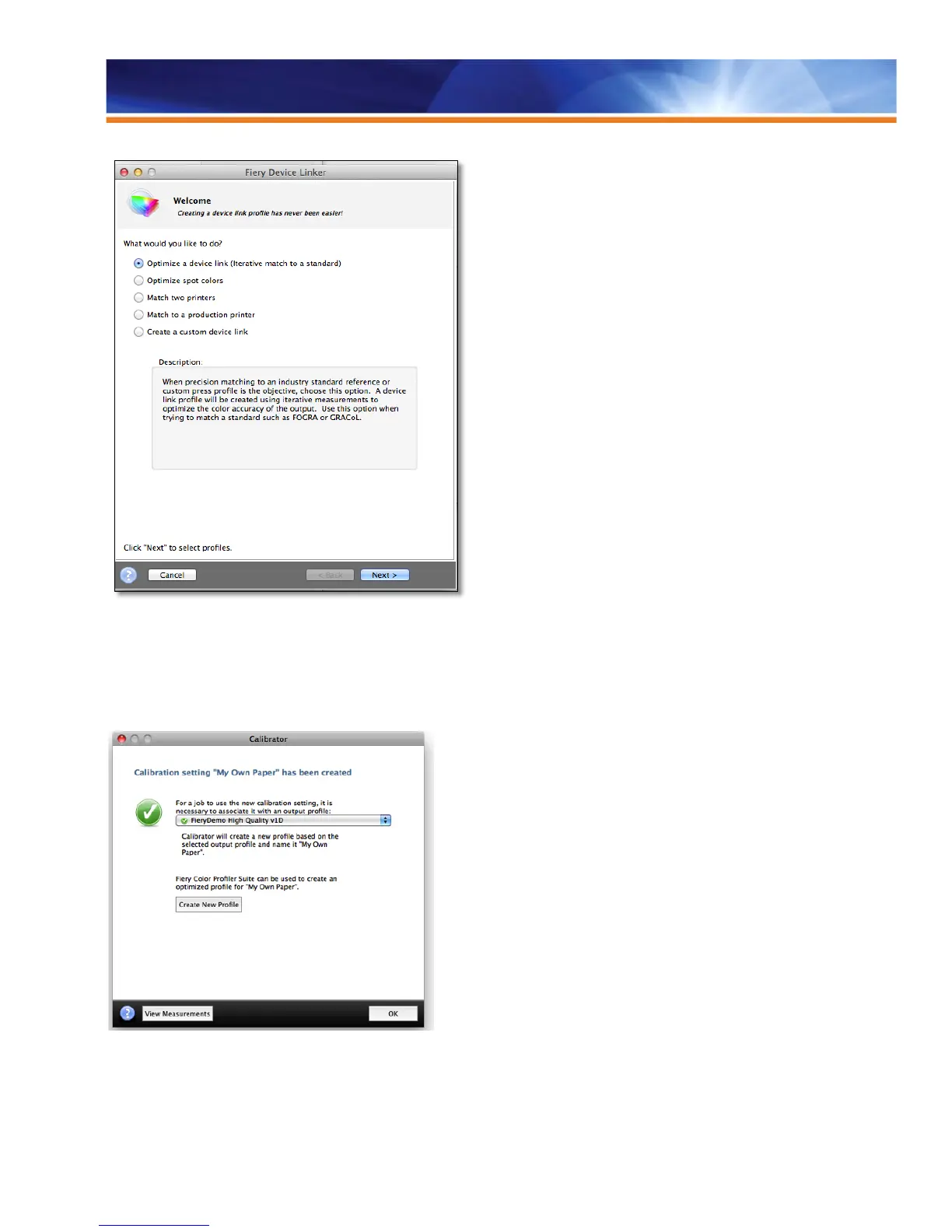 The Color Profiler Suite is now directly integrated with Fiery Calibrator so that the user can choose Manage Calibration Sets to create new