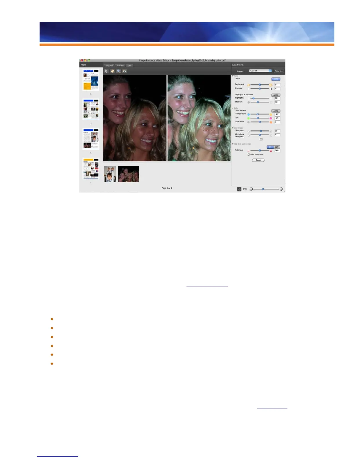 as charts and graphs. Image Enhance Visual Editor supports RGB and CMYK input color and does not preview spot colors and inter-