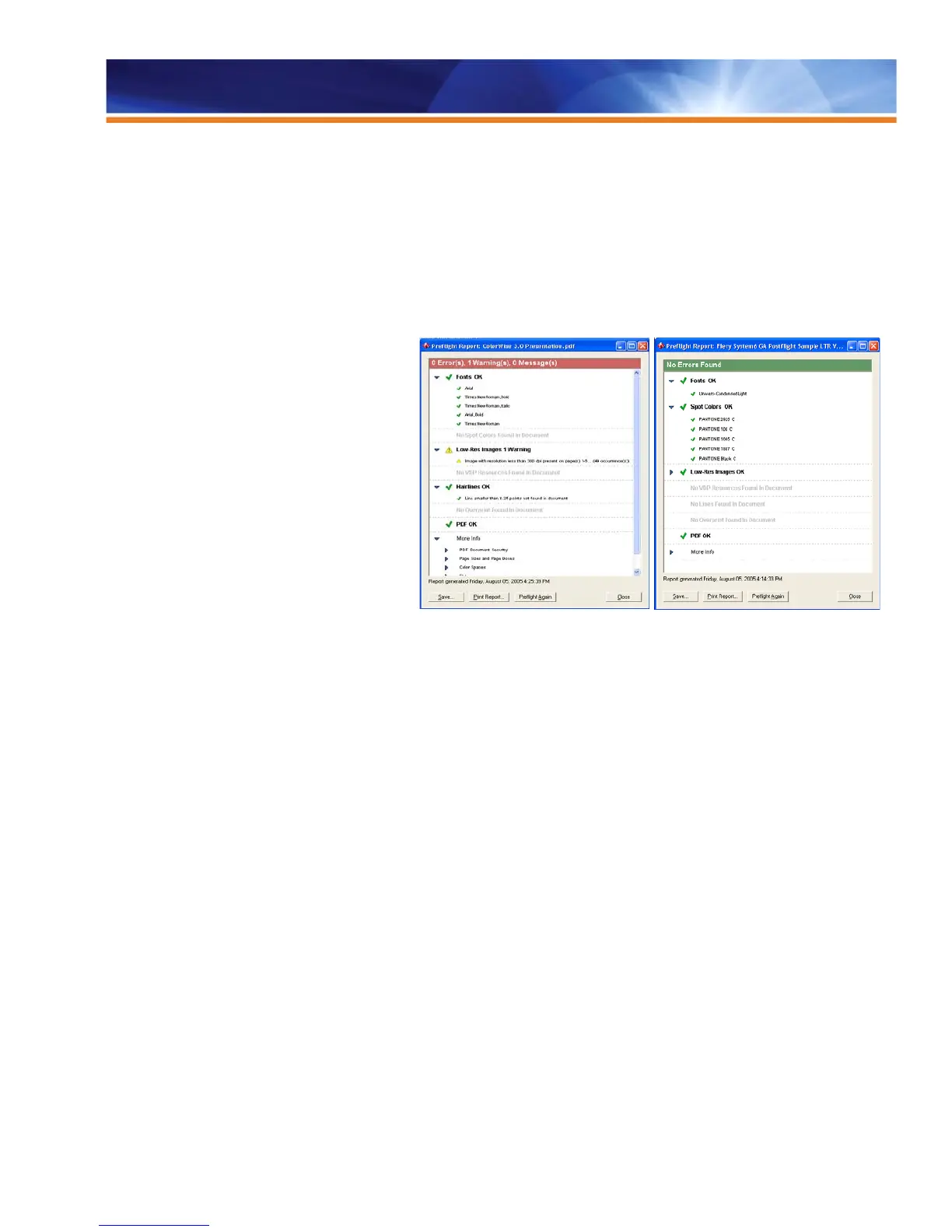 sees the Preflight report displayed on the screen in a