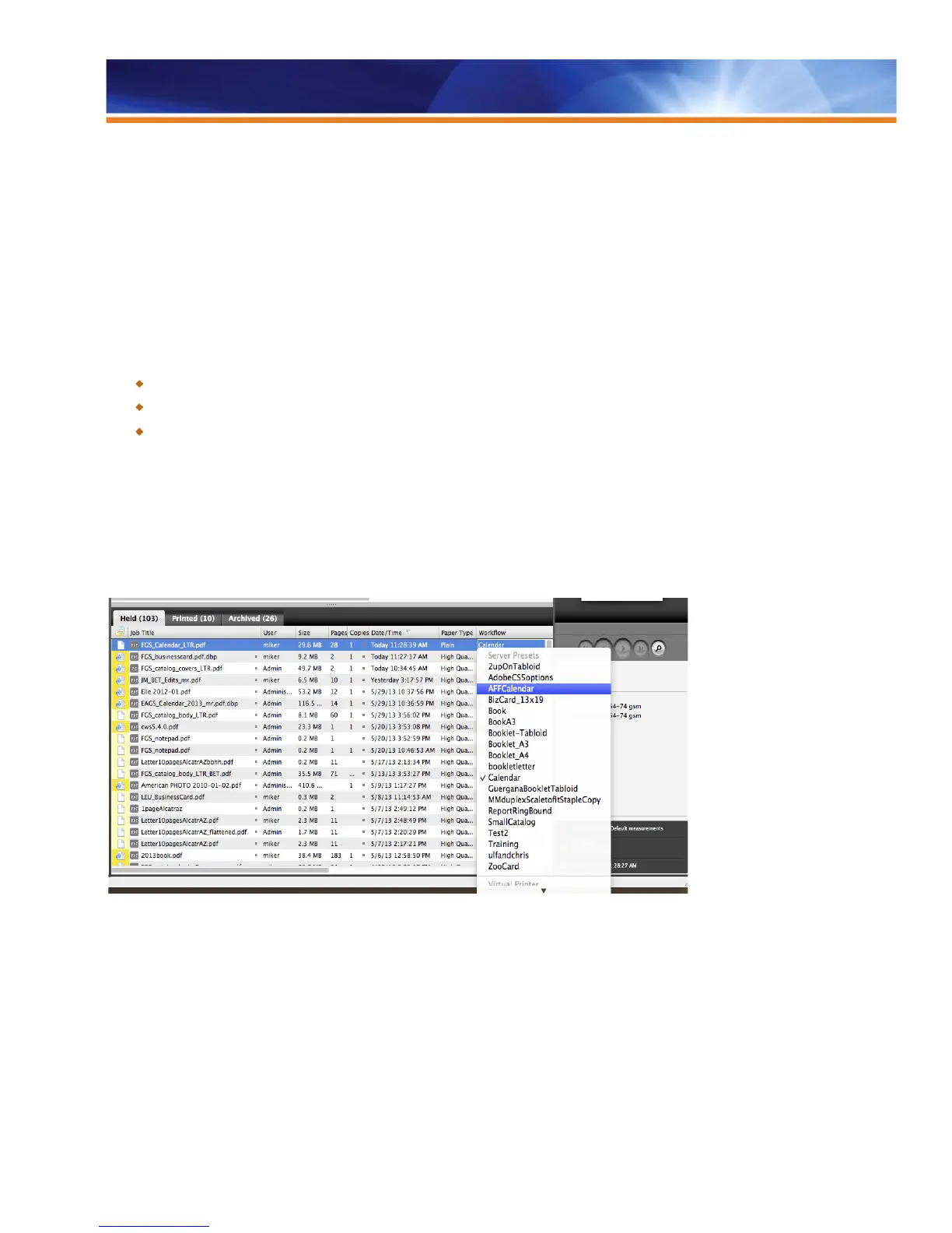 • Provides Fiery system actions such as Hold, Process and Hold, Print, and Print and Hold.