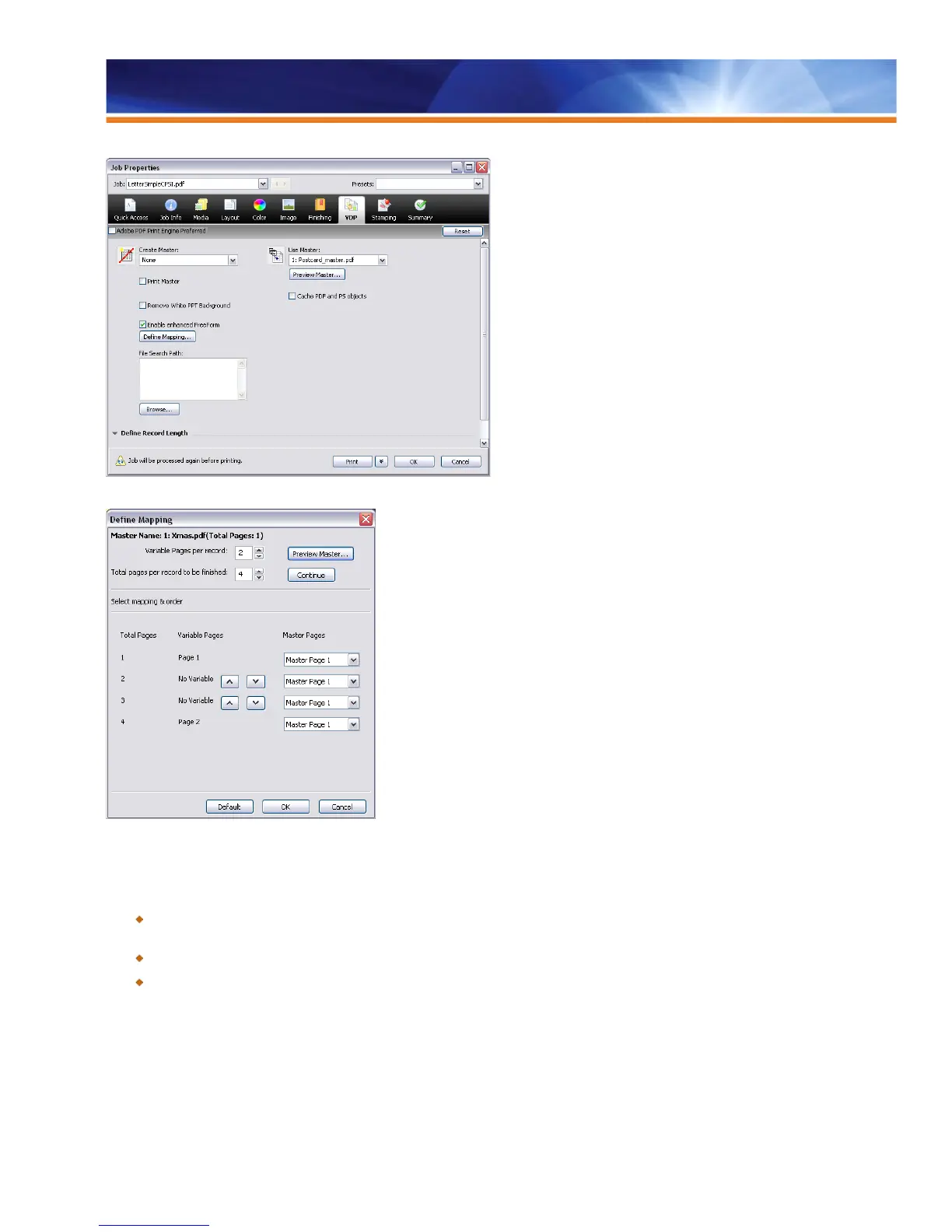 Simplifies creating and using VDP documents by allowing users to map variable documents to master documents without