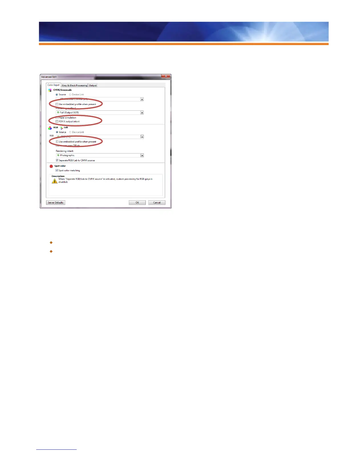 Fiery Expert Color settings for use with PDF/X Output Intent and/or embedded source profiles