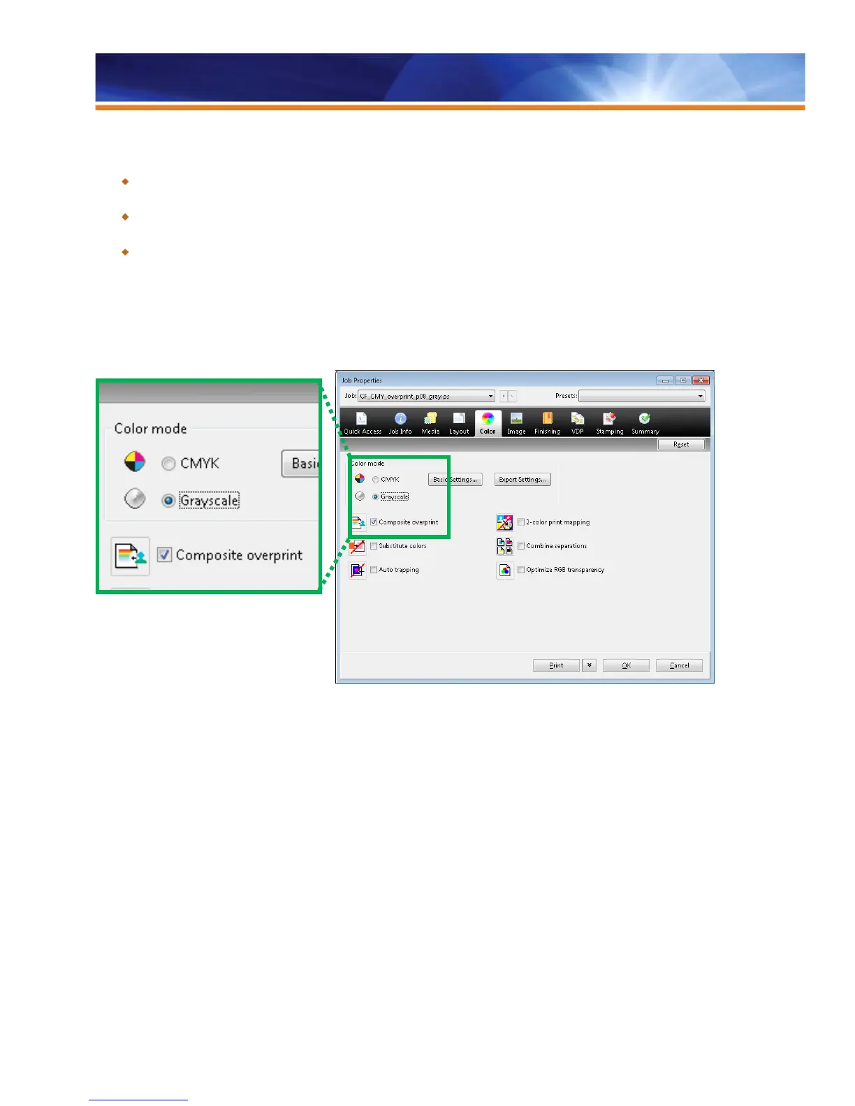 Grayscale and Composite Overprint settings need to be selected in Job Properties to guarantee correct representation of overprints