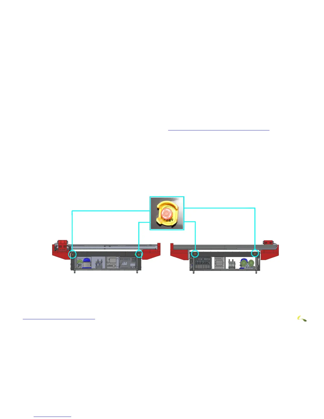 are located on both the right and left sides of the front and rear print areas. When pressed, an emergency stop button does the following: