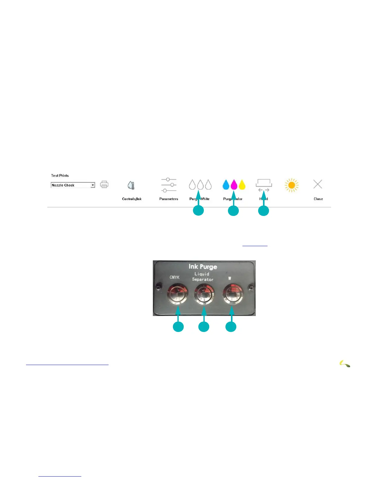 1Purges white ink. Sweeps the heads. 2 Purges CYMK ink. Sweeps the heads. 3 Sweeps all print heads.
