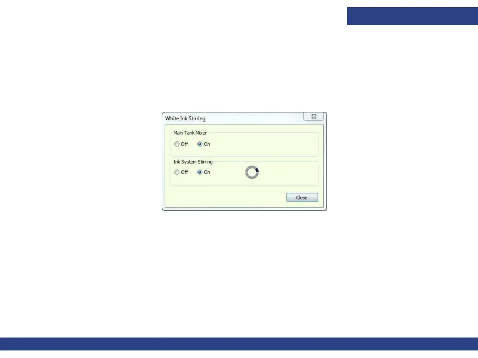 2. Select both ON radio buttons to stir the White Ink, and close the dialog. This process takes a few seconds, but you can continue