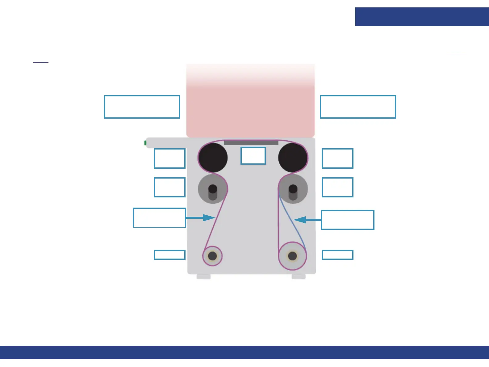 The media is fed to the printer from the media roll on the rear air shaft, through the pinch roller, above the tension roller,