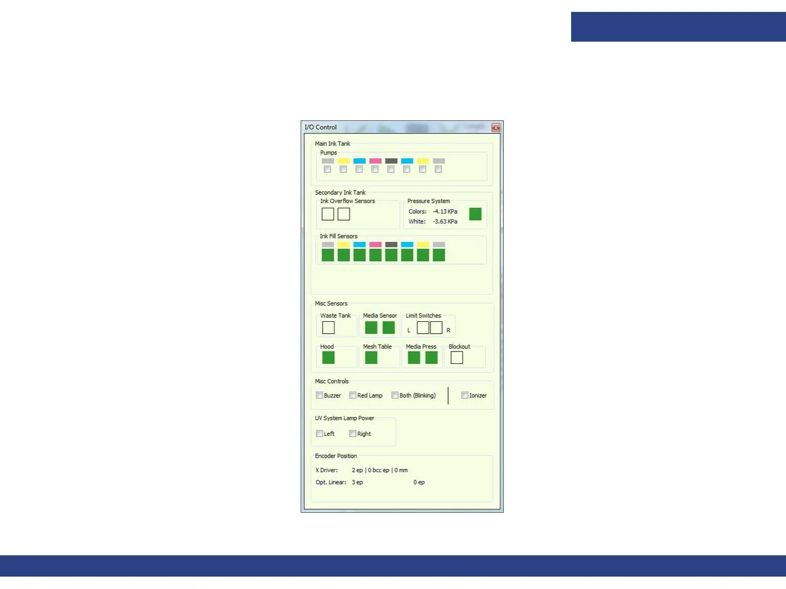 The I/O Control dialog box displays the status of the printer’s electronic systems. Screen components that are