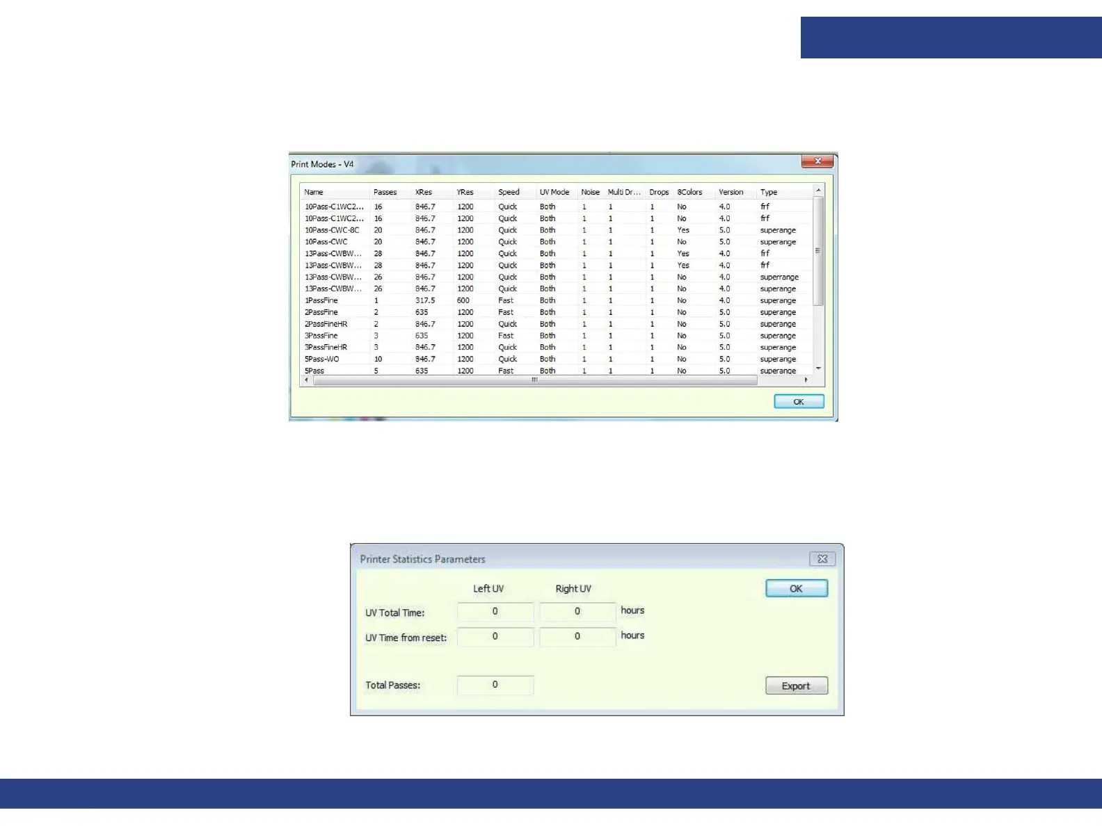 The Printer Statistics Parameters window shows the usage statistics of the UV LED lamps, for operator’s information only.