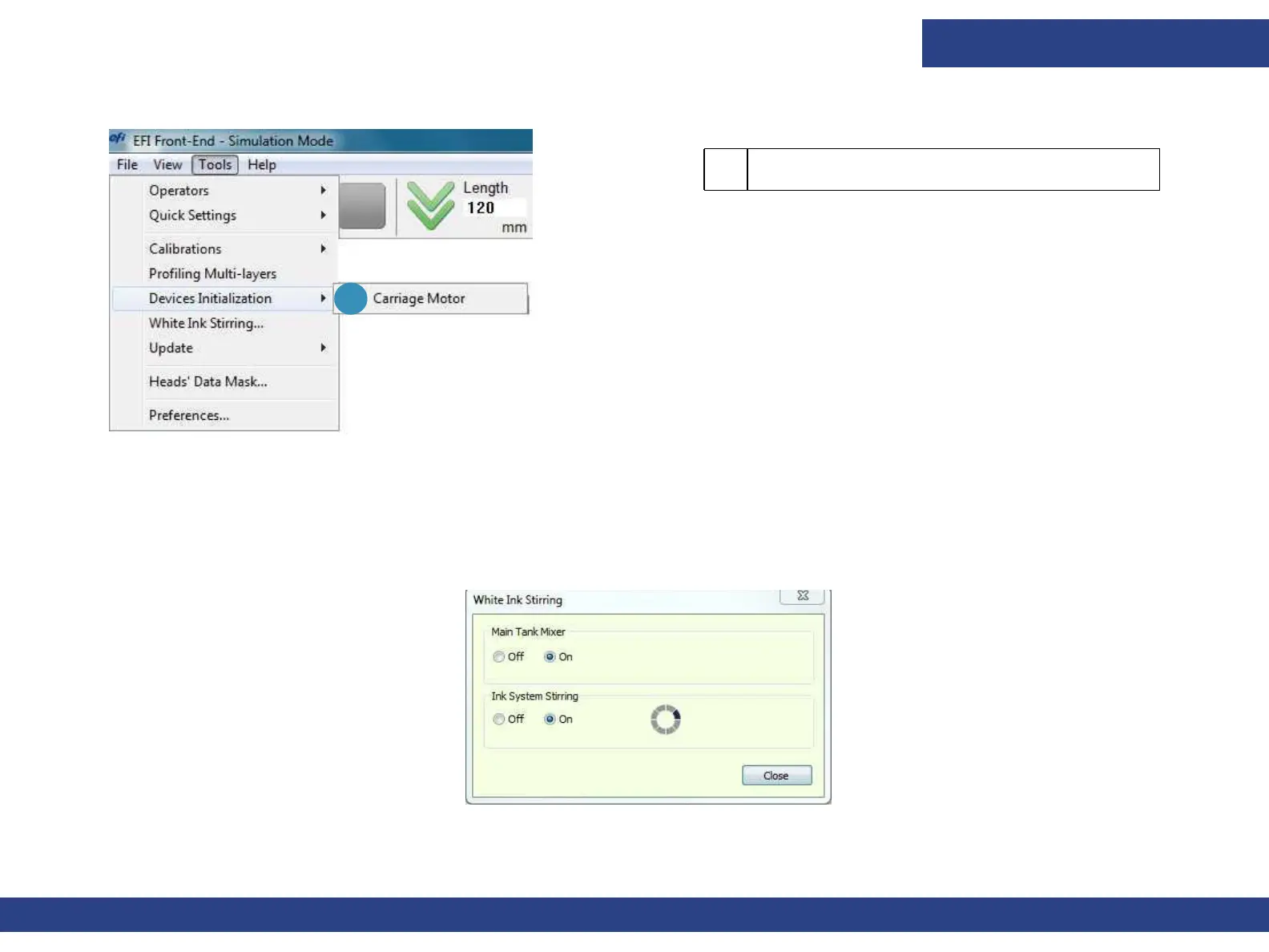 turn off or on the Main Ink Tank Mixer and Ink System Stirring. When on, these options stir the white ink for 30 seconds.