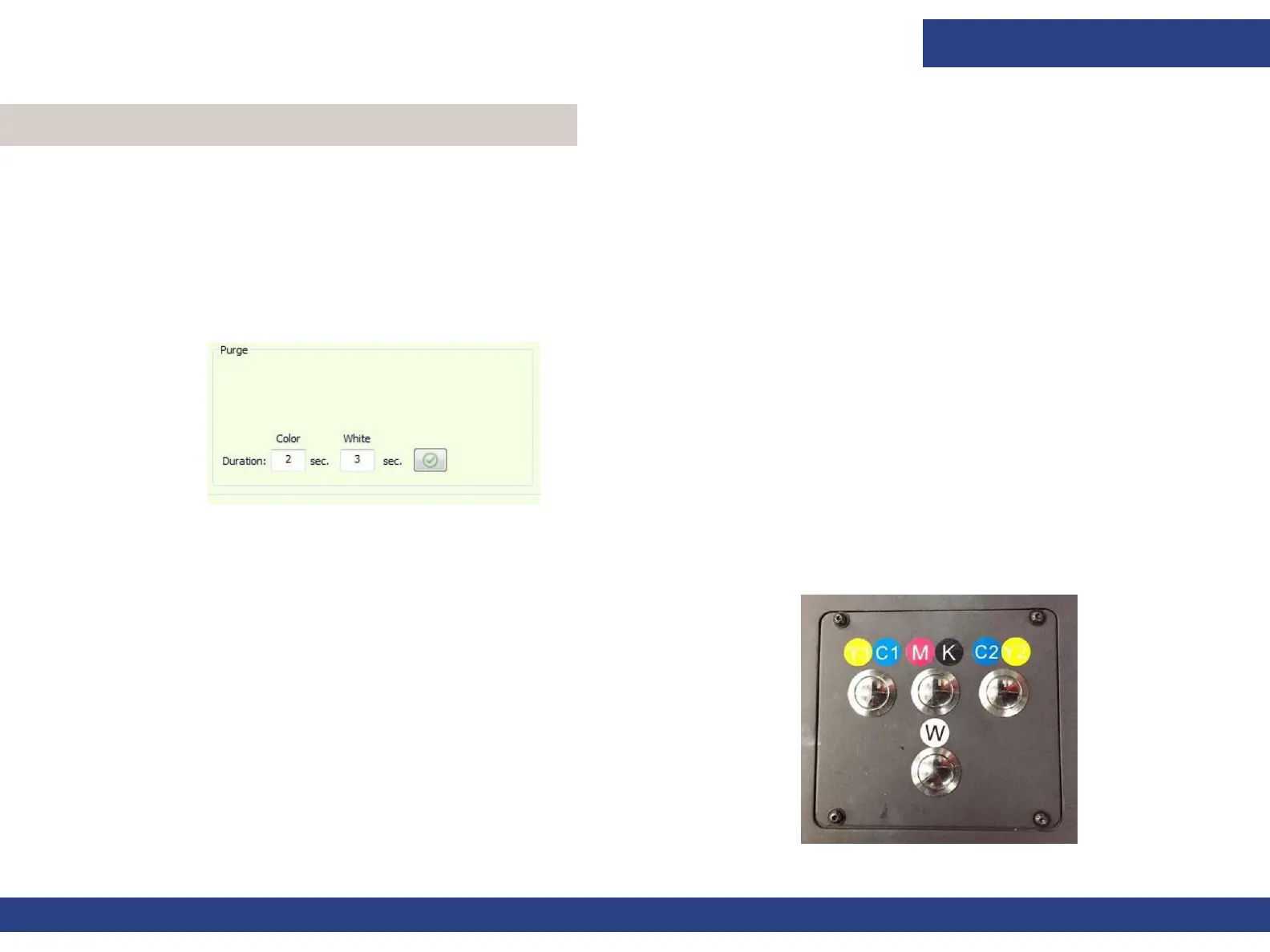 the print head and drips onto the ink tray. The purge duration can be controlled through the Duration field in the Front