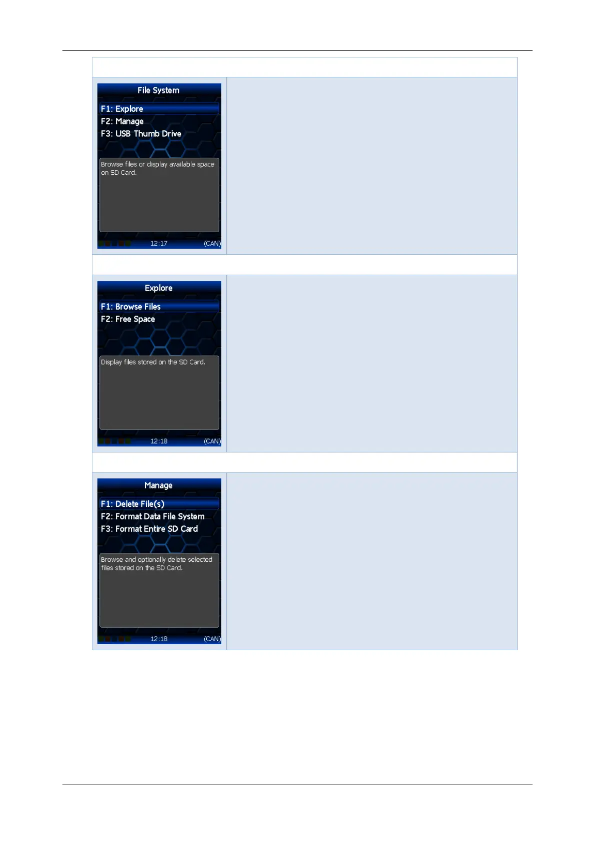 F1: Browse Files; Display files stored on the SD