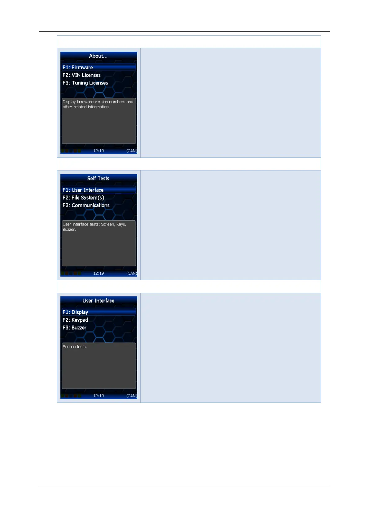 Options -> [F4: Self Tests] -> [F1: User Interface] menu