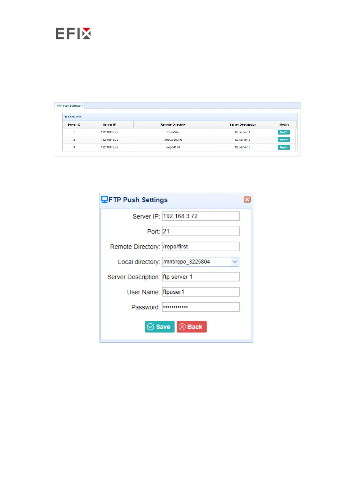 Tap Modify button on the right of the required FTP server and the FTP Push Settings screen