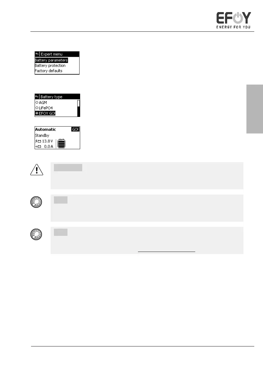 Vælg EFOY GO! som batteritype på betjeningspanelet på EFOY COMFORT