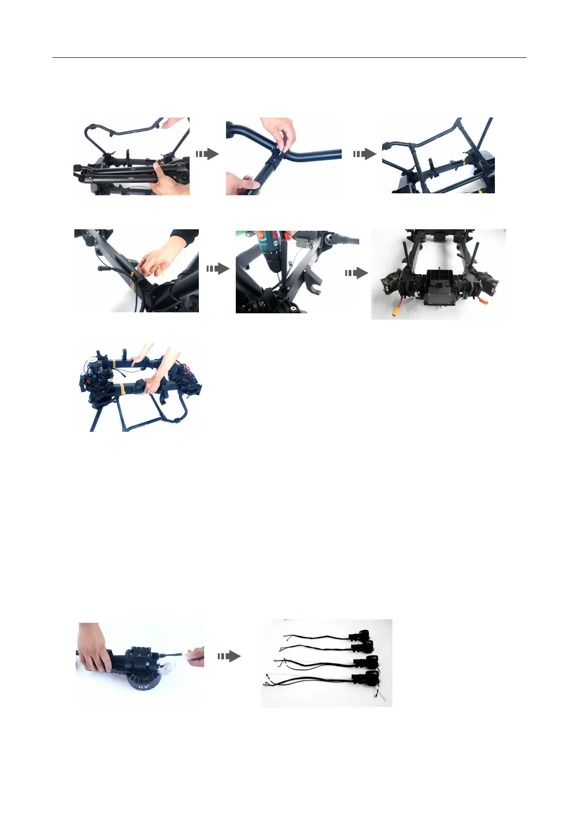 2. Insert the 4 motor sets and cables into the carbon tube arm, and fix them with the screws on t he motor base, do not tighten them