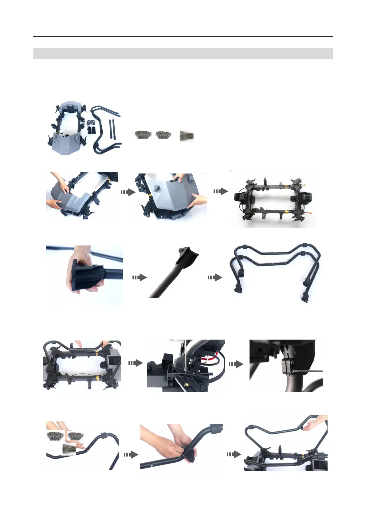 1. Open the package, take out the drone frames , the landing gear and crossbar components as well as the mountings and screws.
