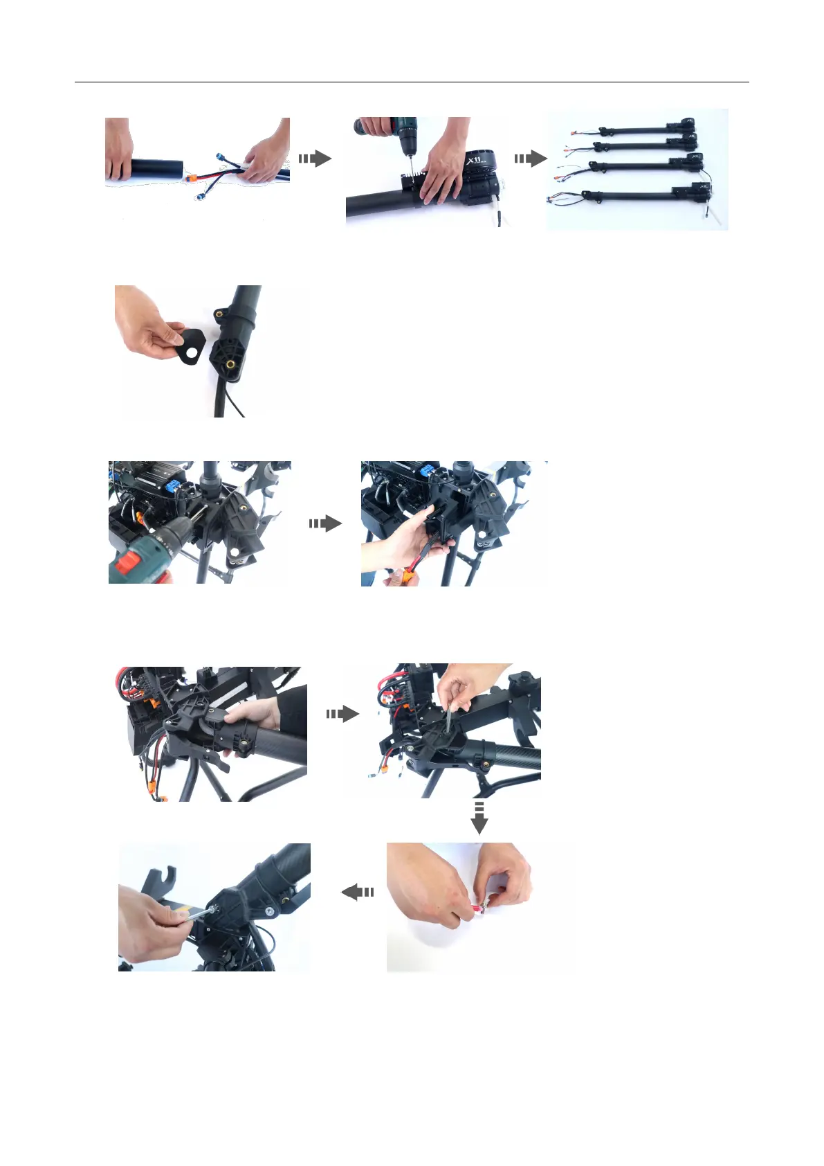 5. Put the arm with the nozzle adapter cable, the water pipe into the rear frame folder, and the arm without the water pipe into t he
