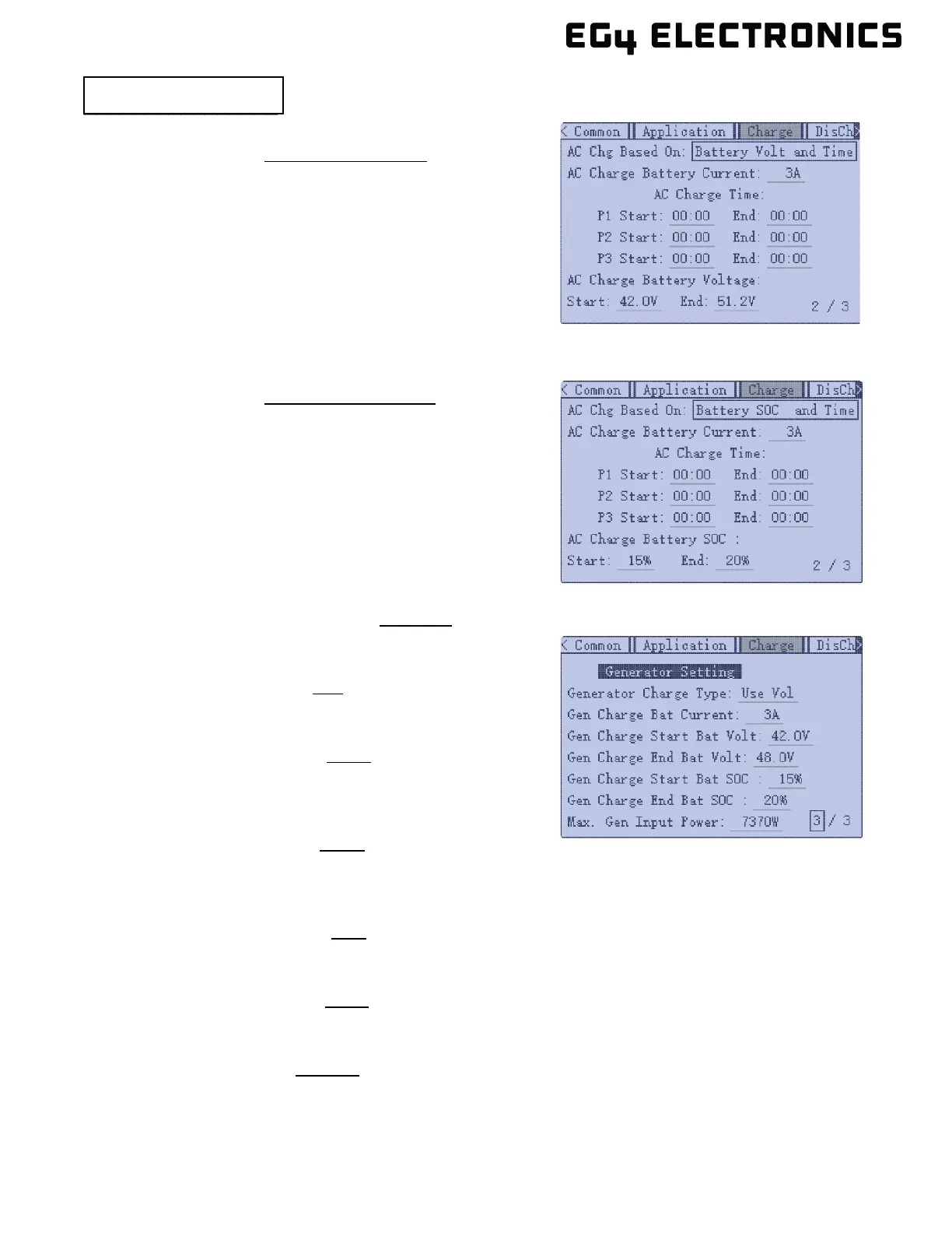 Starts the generator using dry contacts when battery SOC% is below the generator charge start