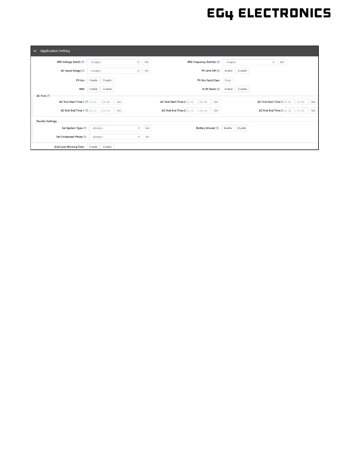 • EPS Voltage Set(V): Set the voltage to accommodate the rated grid voltage.