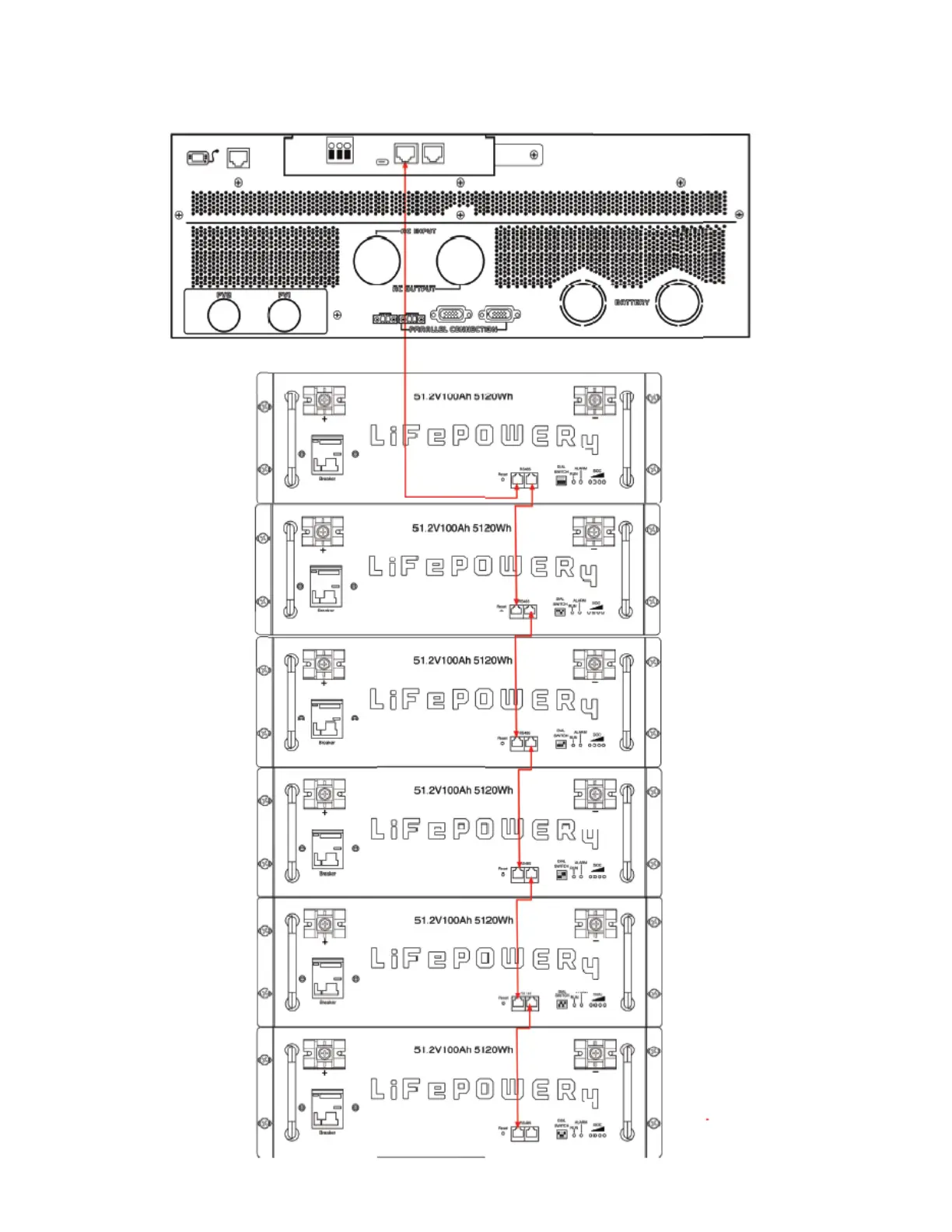 Using the 1ft RS485 cable, interconnect the batteries as illustrated in the diagram below.