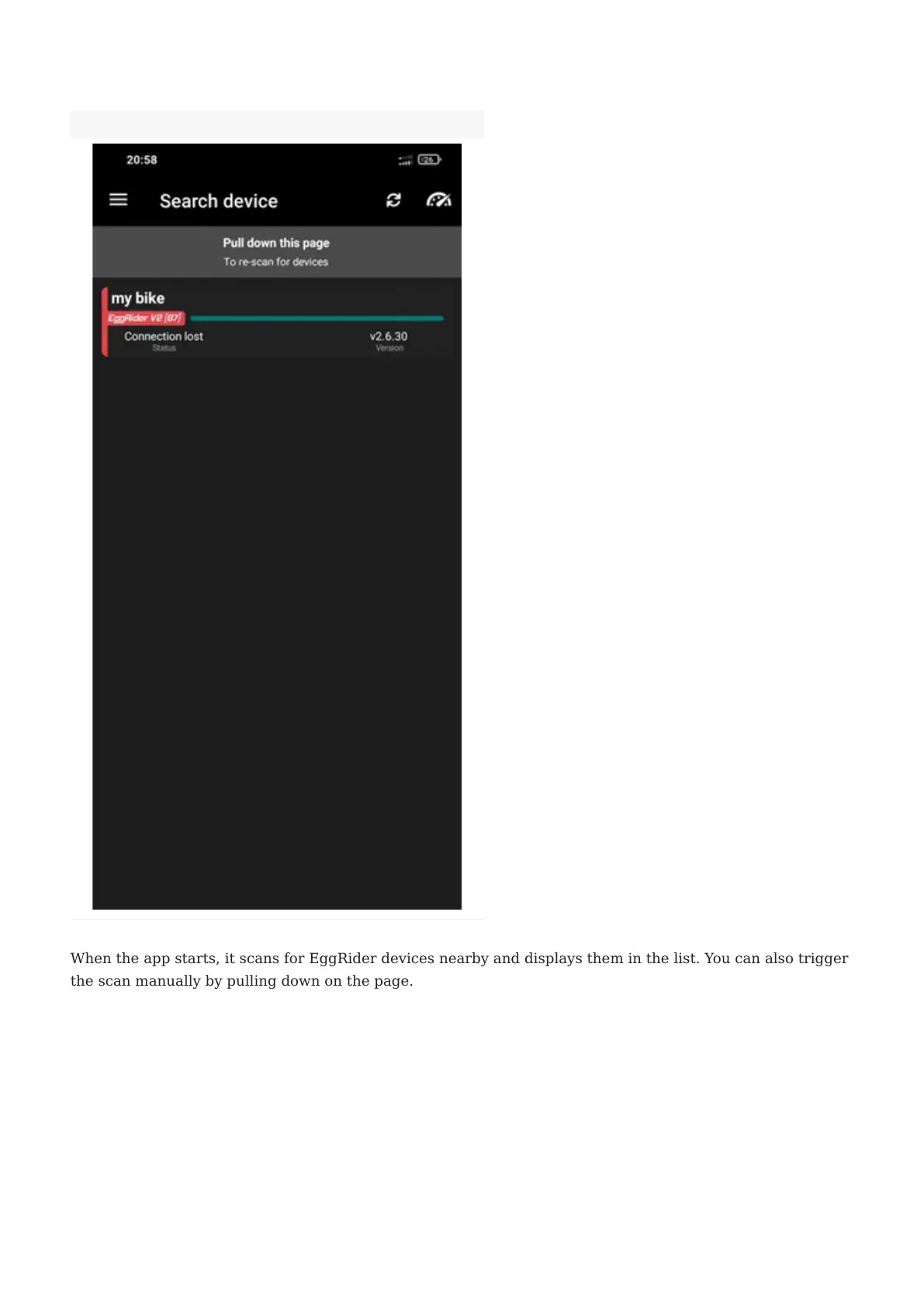 When the app starts, it scans for EggRider devices nearby and displays them in the list. You can also trigger