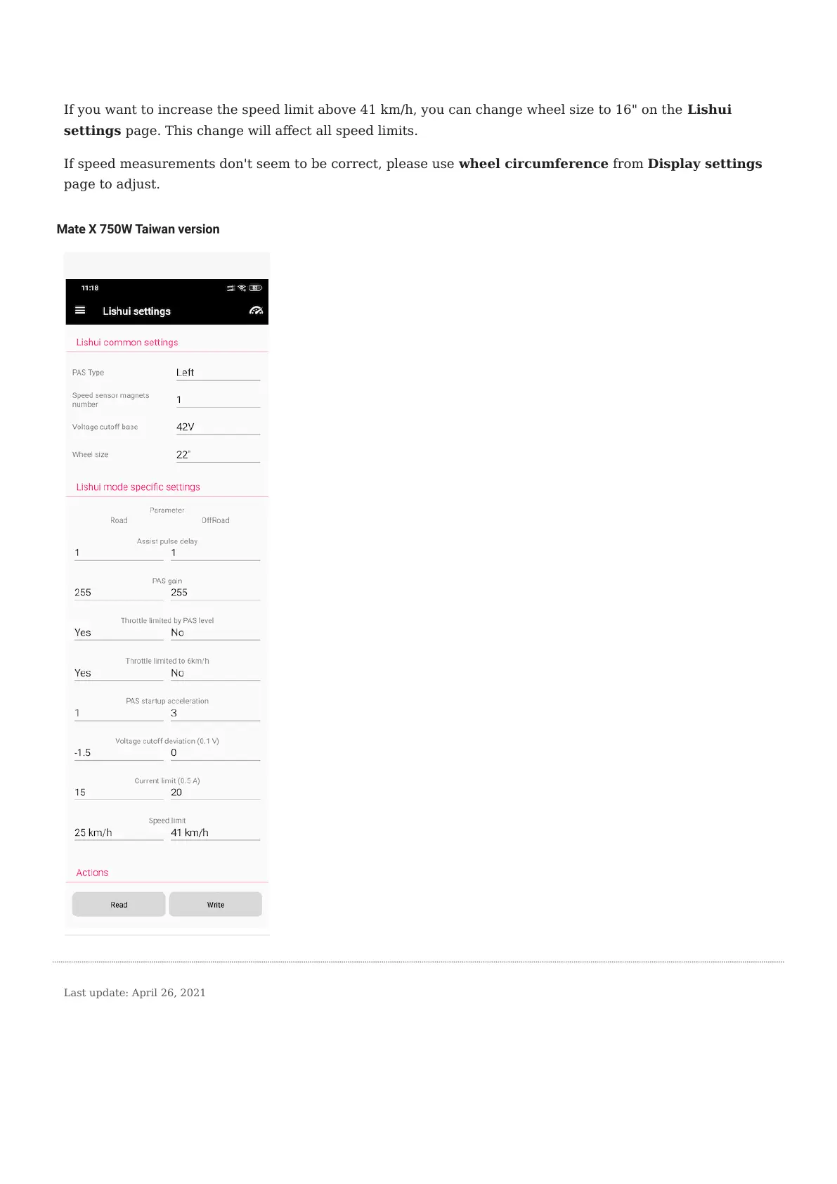 If you want to increase the speed limit above 41 km/h, you can change wheel size to 16" on the Lishui