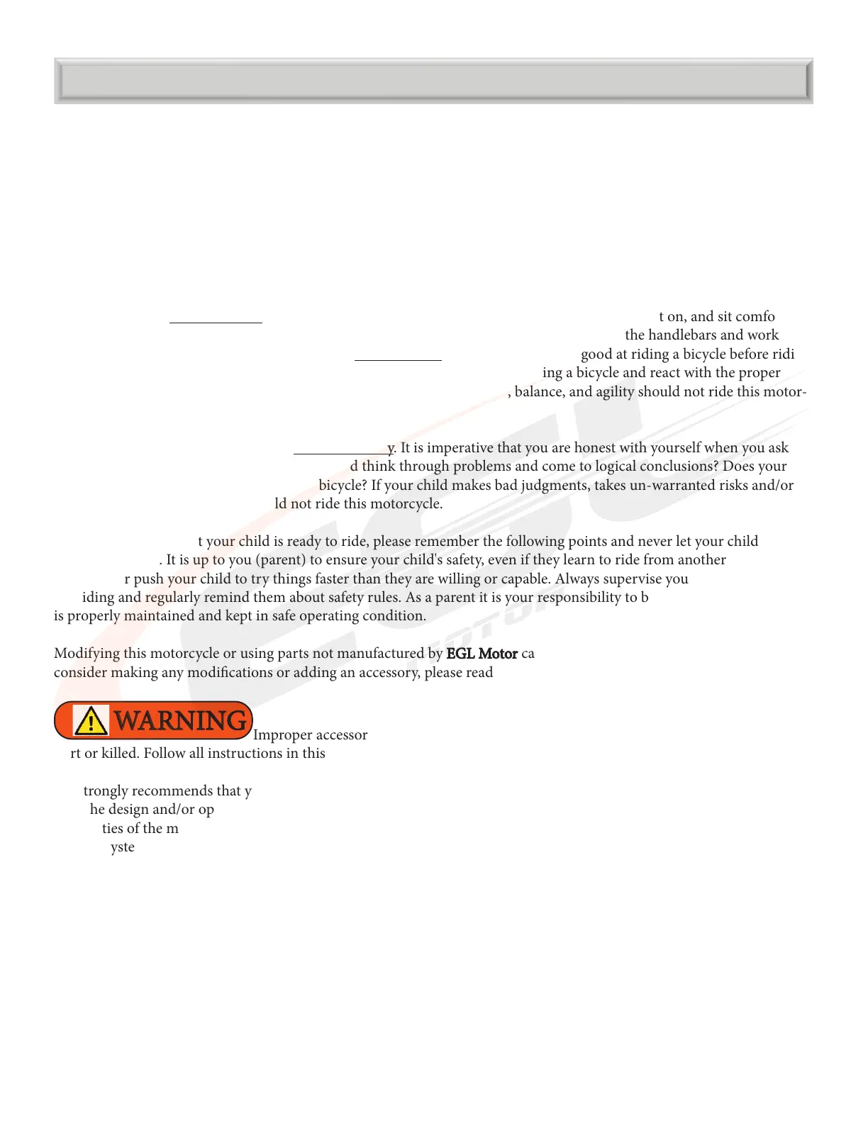 Modifying this motorcycle or using parts not manufactured by EGL MotorEGL Motor can make your motorcycle unsafe. Before you