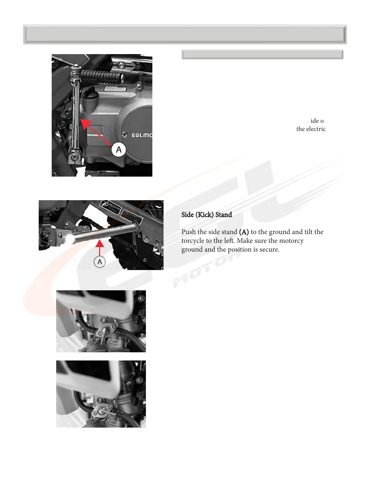 Push the side stand (A)(A) to the ground and tilt the mo-