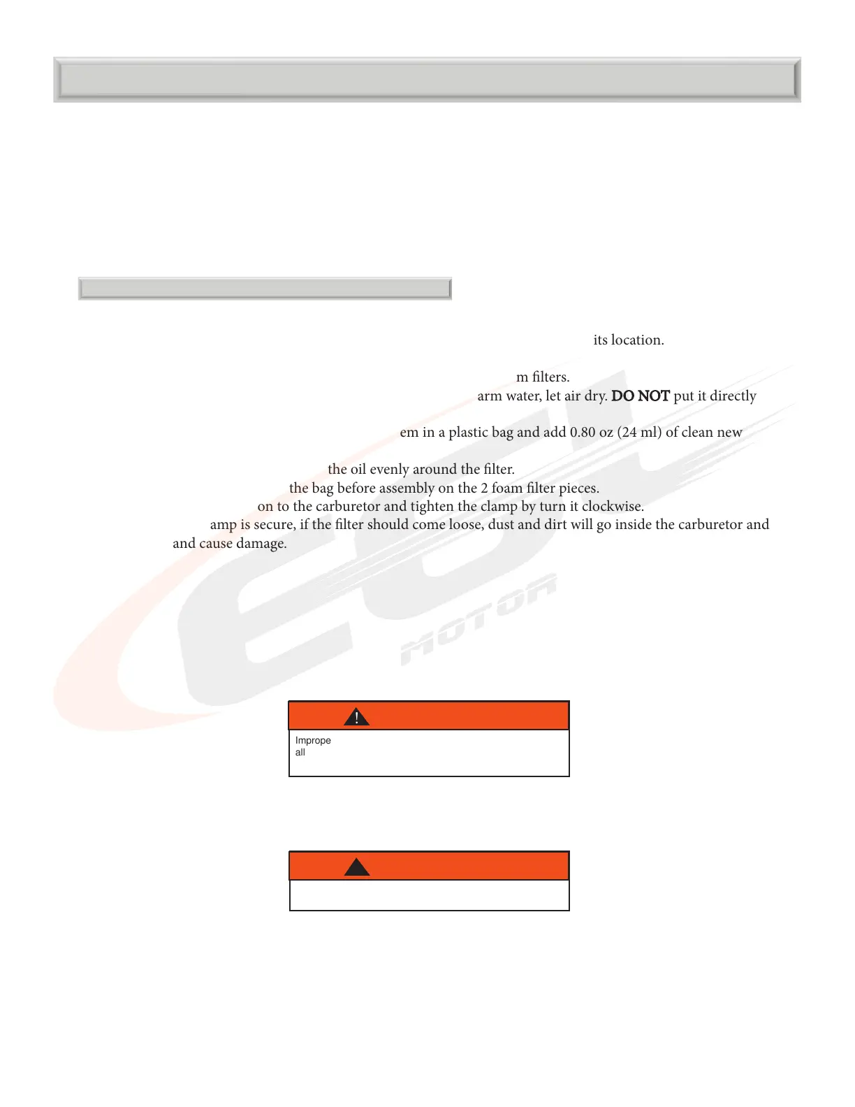 will allow dirt, dust, mud or other impurities to pass into the engine. If you are riding in wet and/or muddy areas,